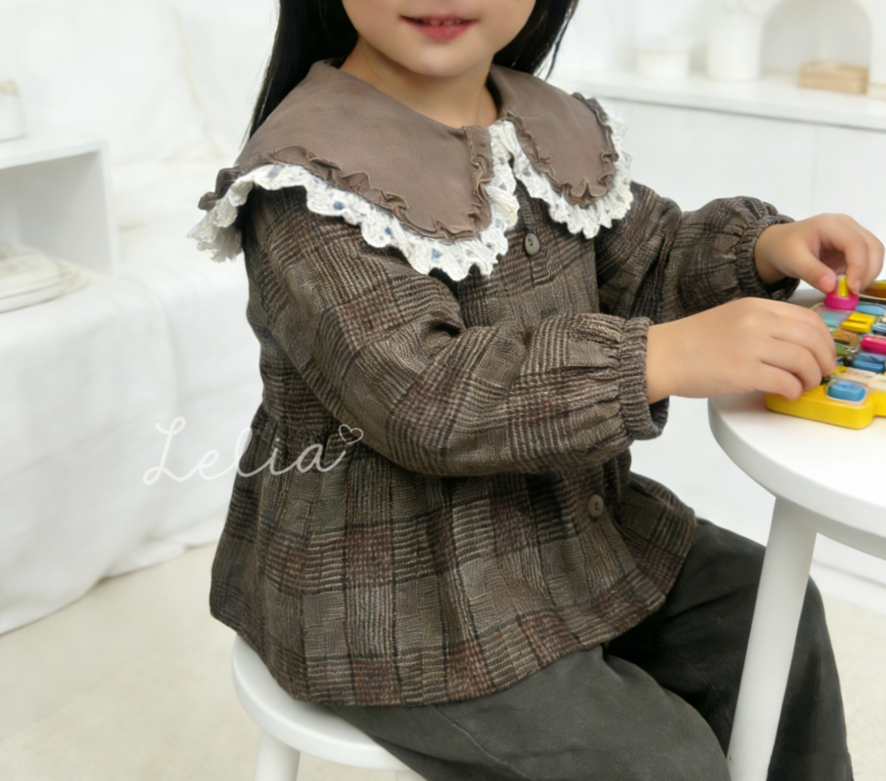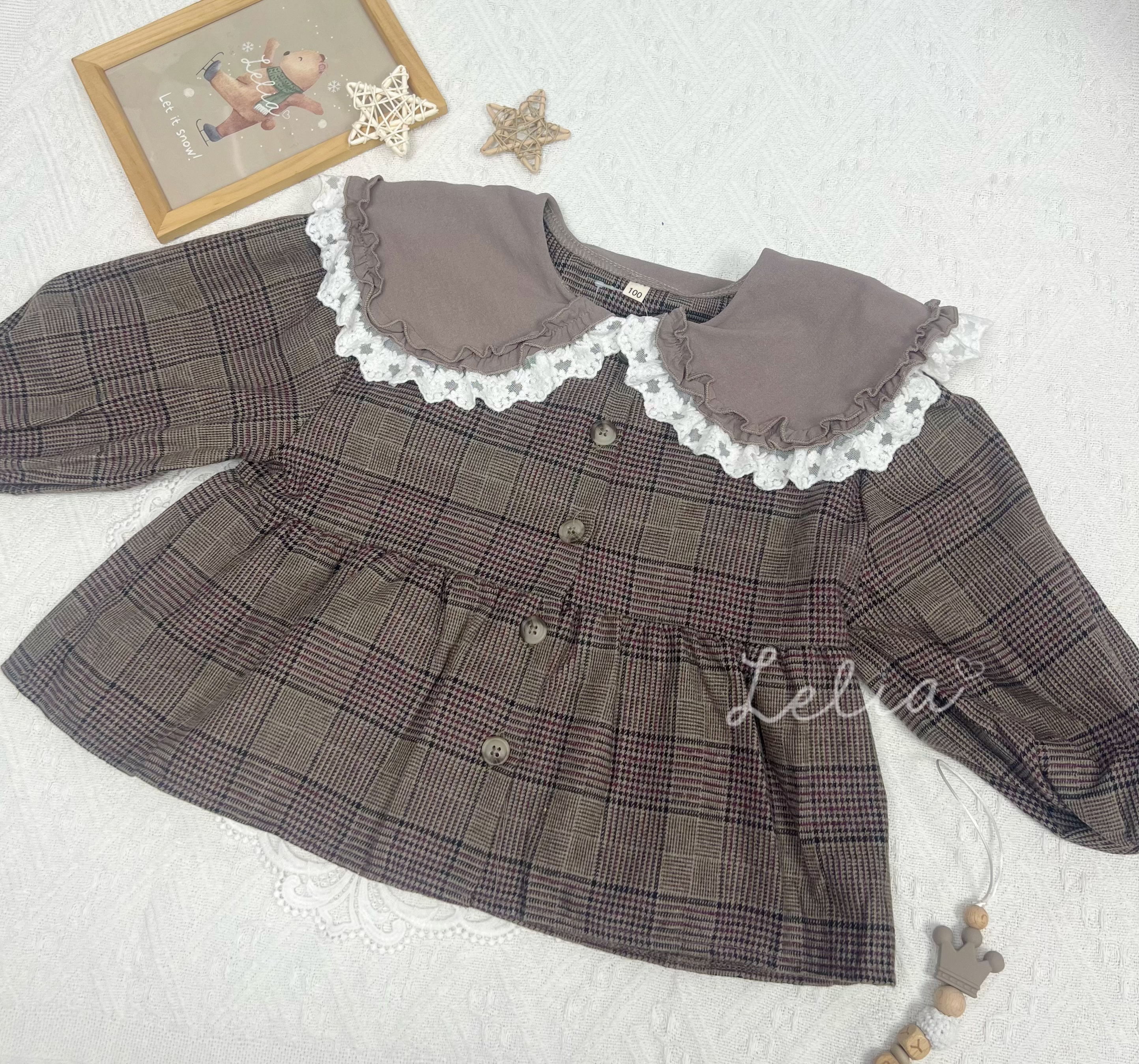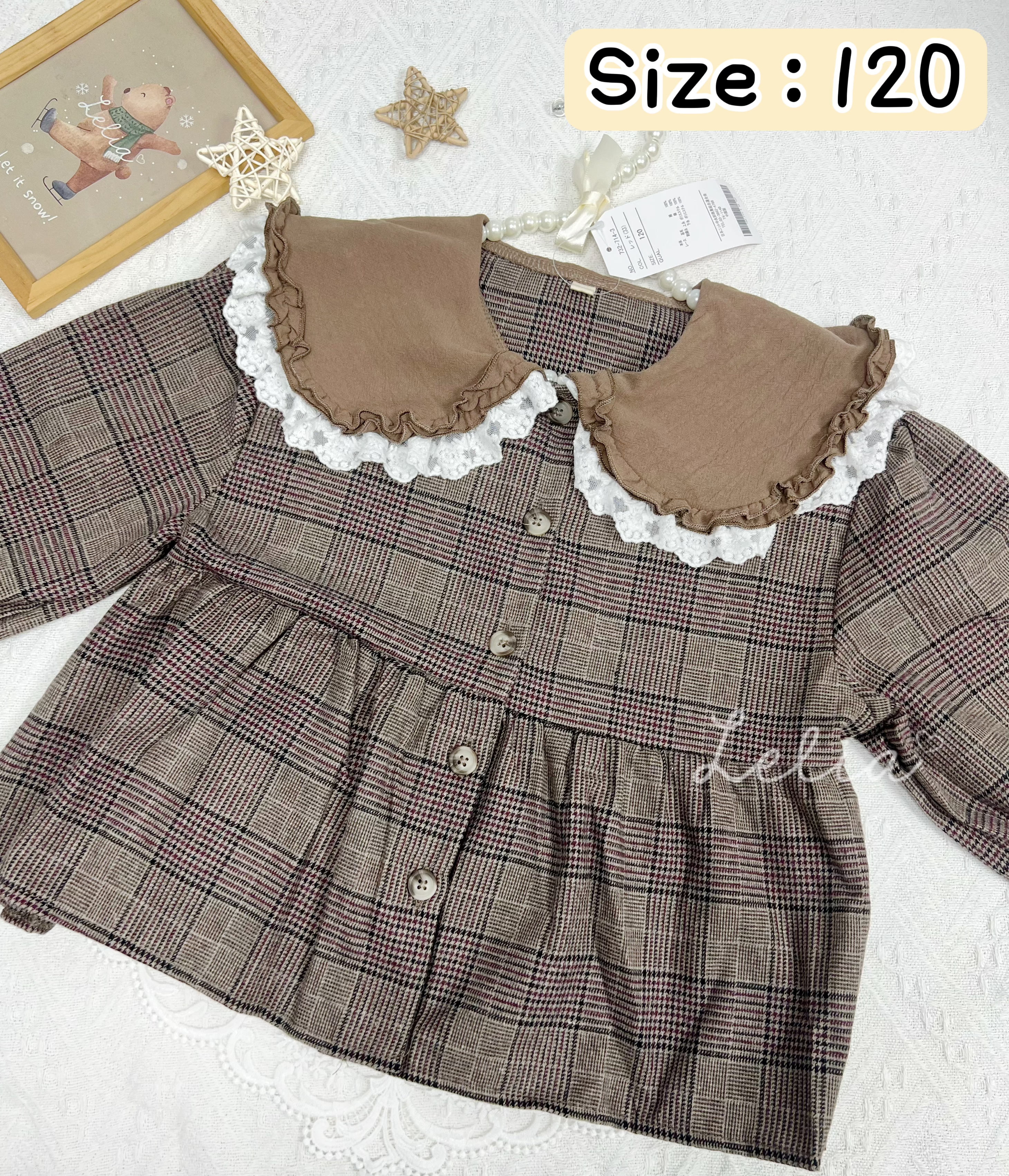 白色Lace邊為深色格仔加添了一份可愛❤️ 呢款影相好搶鏡☺️ Size120領位顏色係深少少的啡色(見最後圖片)